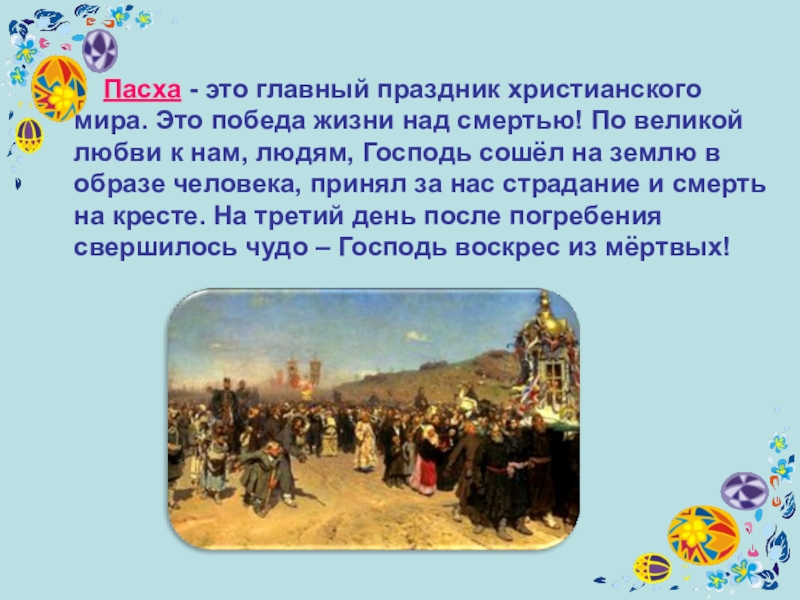 победа жизни над смертью! По великой любви к нам, людям, Господь сошёл на землю в образе человека, принял за нас страдание и смерть на кресте. На третий день после погребения свершилось чудо – Господь воскрес из мёртвых!