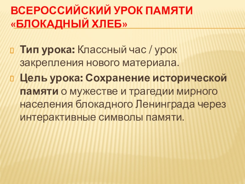 Цель урока: Сохранение исторической памяти о мужестве и трагедии мирного населения блокадного Ленинграда через интерактивные символы памяти.