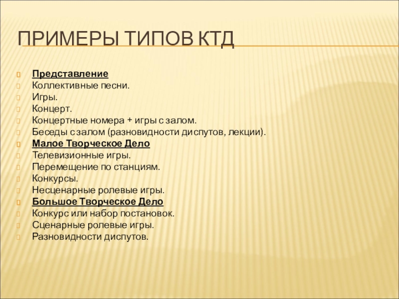 ПРИМЕРЫ ТИПОВ КТДПредставление Коллективные песни. Игры. Концерт. Концертные номера + игры с залом. Беседы с залом (разновидности