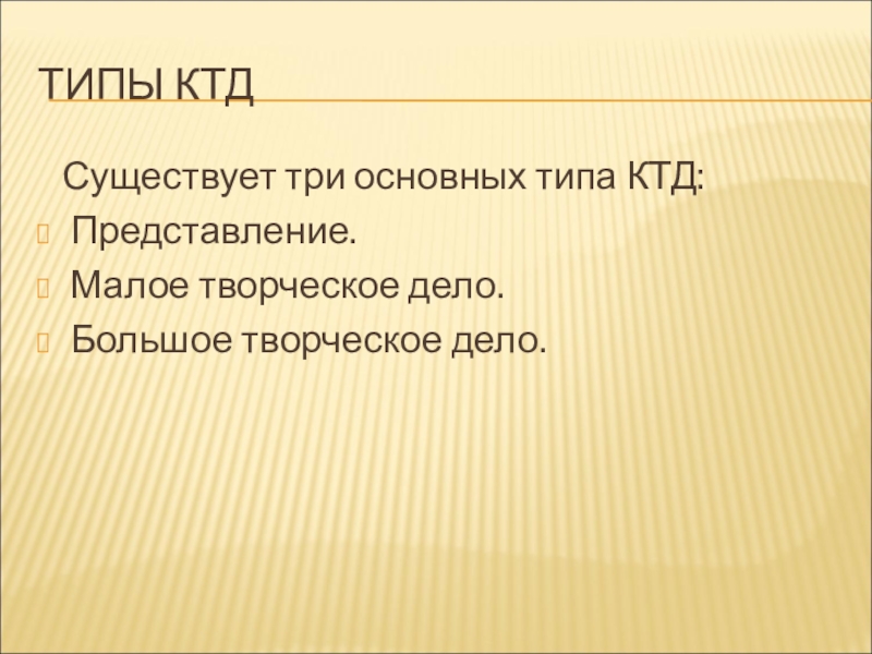 ТИПЫ КТД  Существует три основных типа КТД: Представление. Малое творческое дело. Большое творческое дело.
