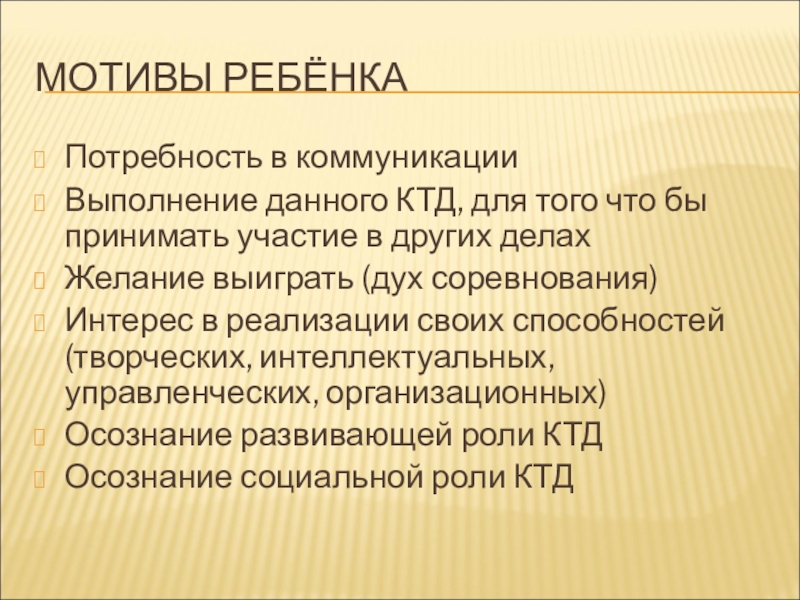 МОТИВЫ РЕБЁНКАПотребность в коммуникации Выполнение данного КТД, для того что бы принимать участие в других делах Желание