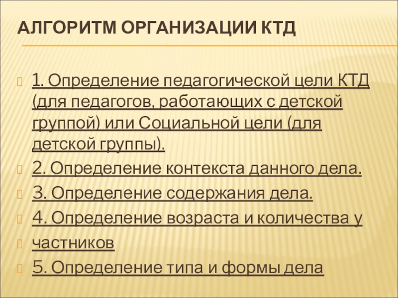АЛГОРИТМ ОРГАНИЗАЦИИ КТД 1. Определение педагогической цели КТД (для педагогов, работающих с детской группой) или Социальной цели