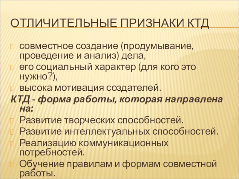 ОТЛИЧИТЕЛЬНЫЕ ПРИЗНАКИ КТДсовместное создание (продумывание, проведение и анализ) дела, его социальный характер (для кого это нужно?), высока