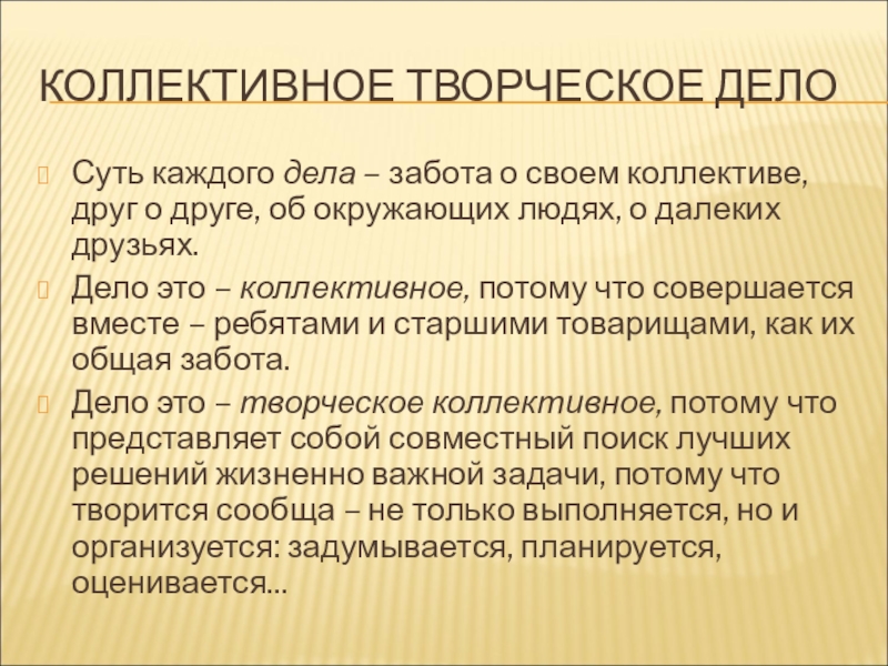 КОЛЛЕКТИВНОЕ ТВОРЧЕСКОЕ ДЕЛОСуть каждого дела – забота о своем коллективе, друг о друге, об окружающих людях, о