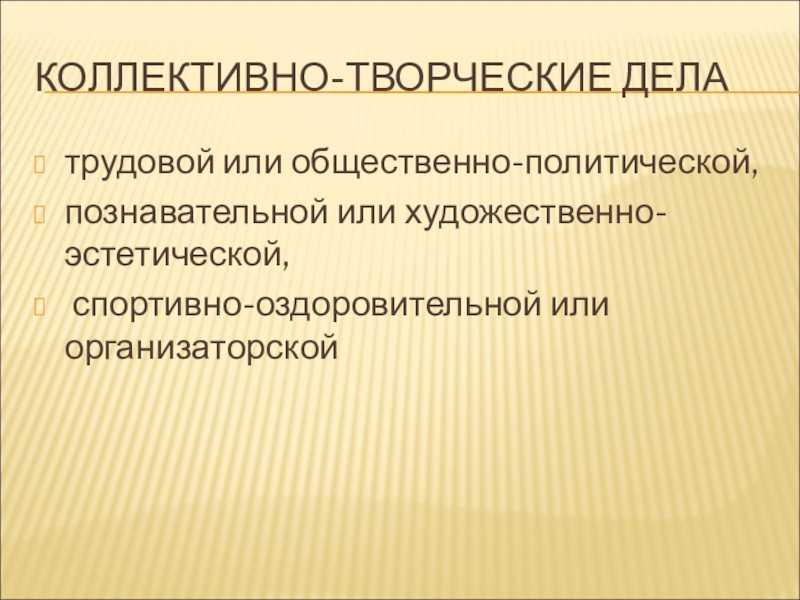 КОЛЛЕКТИВНО-ТВОРЧЕСКИЕ ДЕЛАтрудовой или общественно-политической, познавательной или художественно-эстетической, спортивно-оздоровительной или организаторской