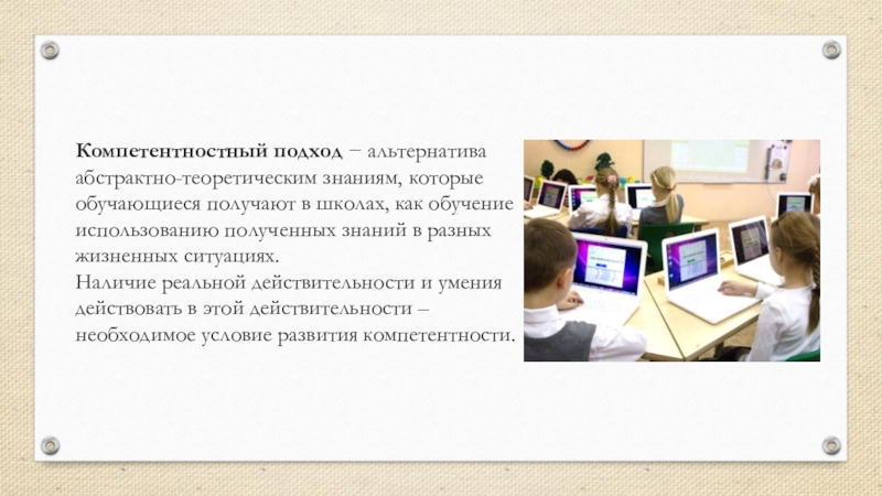 Слайд 13Компетентностный подход − альтернатива абстрактно-теоретическим знаниям, которые обучающиеся получают в школах,