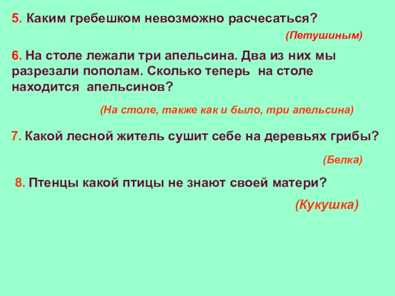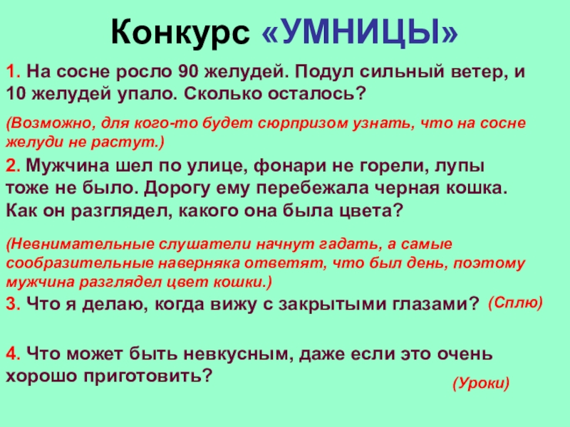 (Невнимательные слушатели начнут гадать, а самые сообразительные наверняка ответят, что был день, поэтому мужчина разглядел цвет кошки.)