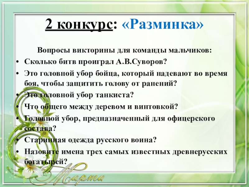 2 конкурс: «Разминка» Вопросы викторины для команды мальчиков: Сколько битв проиграл А.В.Суворов? Это головной убор бойца, который