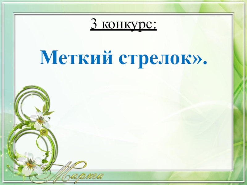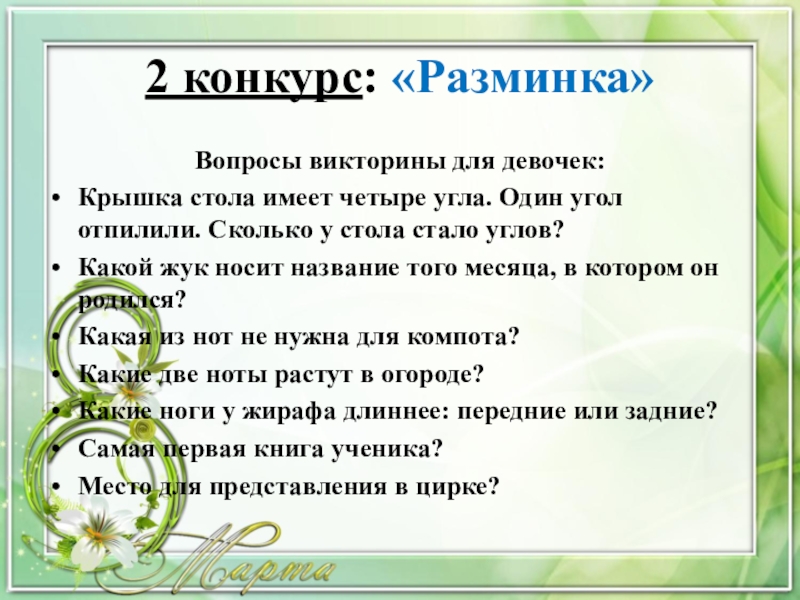 2 конкурс: «Разминка» Вопросы викторины для девочек:Крышка стола имеет четыре угла. Один угол отпилили. Сколько у стола