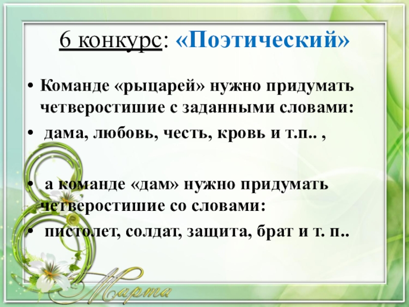 6 конкурс: «Поэтический» Команде «рыцарей» нужно придумать четверостишие с заданными словами: дама, любовь, честь, кровь и т.п..