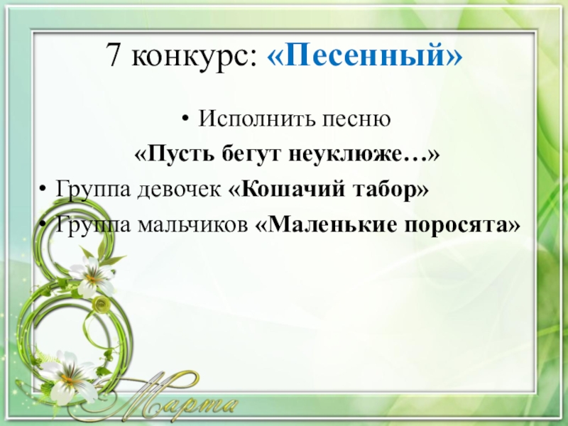 7 конкурс: «Песенный»  Исполнить песню «Пусть бегут неуклюже…»Группа девочек «Кошачий табор»Группа мальчиков «Маленькие поросята»