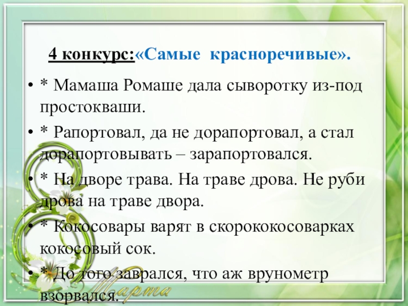 4 конкурс:«Самые красноречивые».  * Мамаша Ромаше дала сыворотку из-под простокваши. * Рапортовал, да не