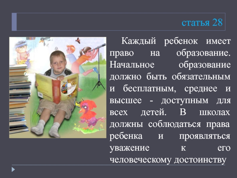 обязательным и бесплатным, среднее и высшее - доступным для всех детей. В школах должны соблюдаться права ребенка и проявляться уважение к его человеческому достоинству