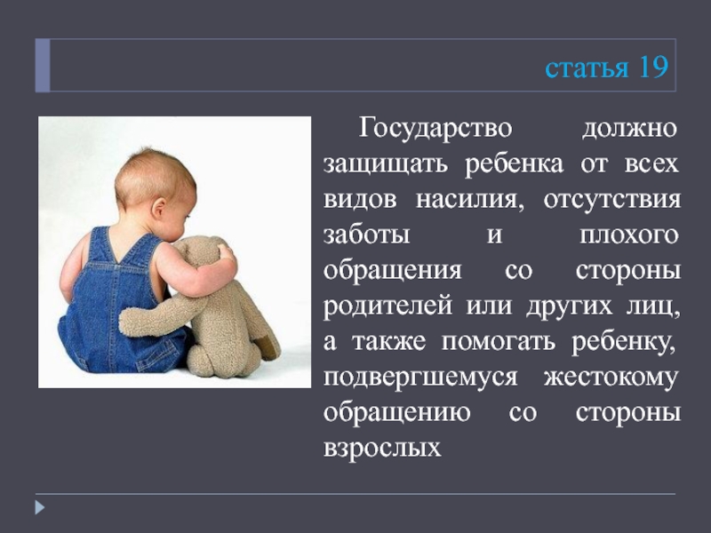 и плохого обращения со стороны родителей или других лиц, а также помогать ребенку, подвергшемуся жестокому обращению со стороны взрослых