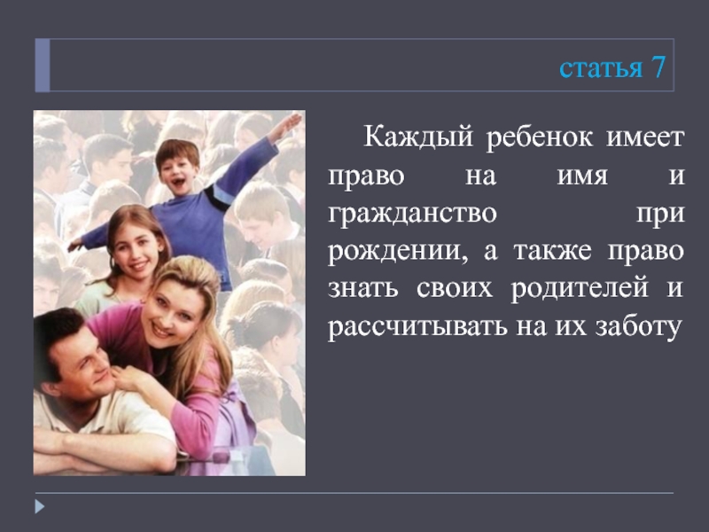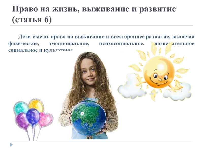Слайд 7Право на жизнь, выживание и развитие (статья 6)