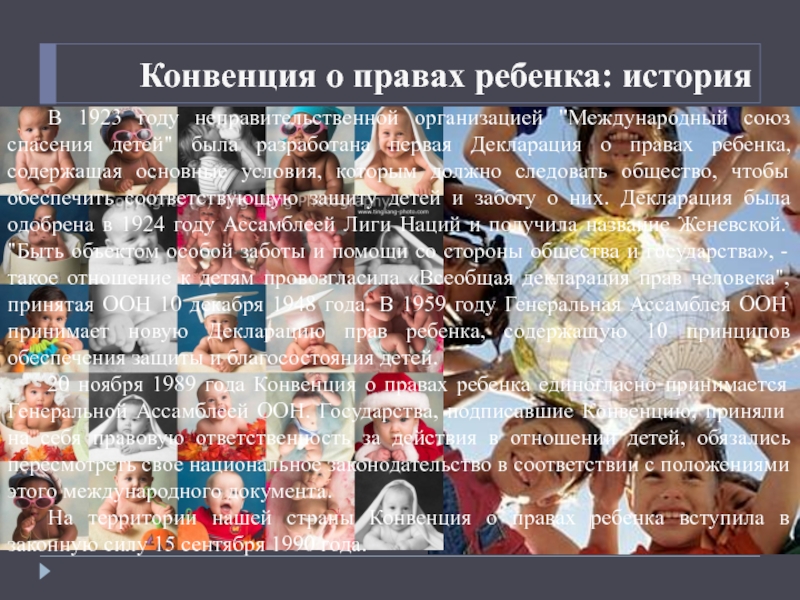 спасения детей" была разработана первая Декларация о правах ребенка, содержащая основные условия, которым должно следовать общество, чтобы обеспечить соответствующую защиту детей и заботу о них. Декларация была одобрена в 1924 году Ассамблеей Лиги Наций и получила название Женевской. "Быть объектом особой заботы и помощи со стороны общества и государства», - такое отношение к детям провозгласила «Всеобщая декларация прав человека", принятая ООН 10 декабря 1948 года. В 1959 году Генеральная Ассамблея ООН принимает новую Декларацию прав ребенка, содержащую 10 принципов обеспечения защиты и благосостояния детей.