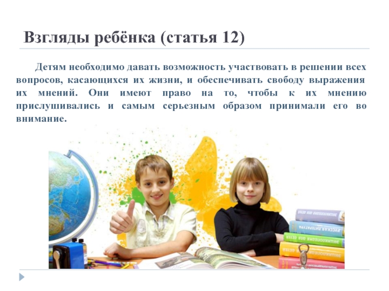 вопросов, касающихся их жизни, и обеспечивать свободу выражения их мнений. Они имеют право на то, чтобы к их мнению прислушивались и самым серьезным образом принимали его во внимание.