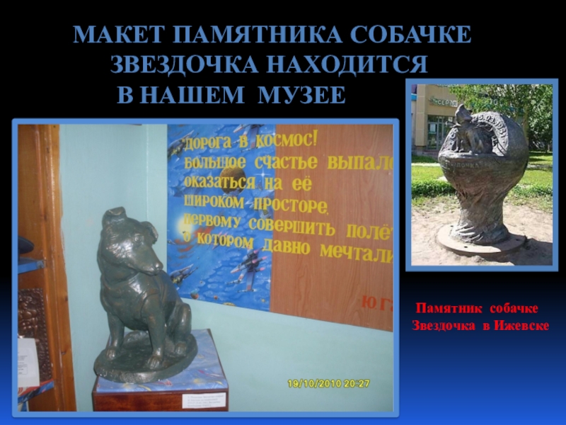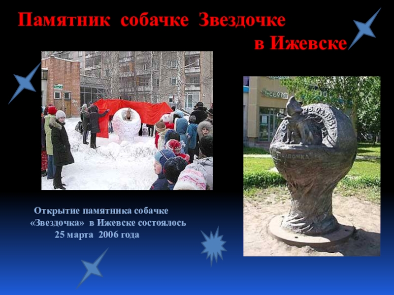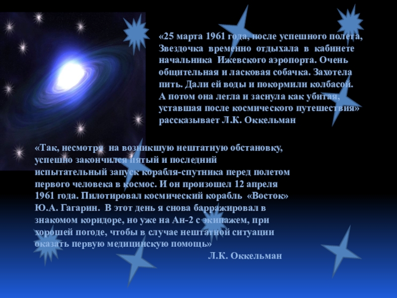 «25 марта 1961 года, после успешного полета, Звездочка временно отдыхала в кабинете начальника Ижевского аэропорта. Очень общительная и ласковая собачка. Захотела пить. Дали ей воды и покормили колбасой.