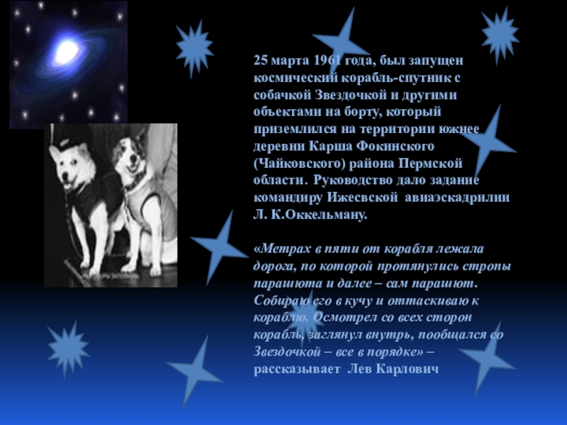 25 марта 1961 года, был запущен космический корабль-спутник с собачкой Звездочкой и другими объектами на борту, который приземлился на территории южнее деревни Карша Фокинского (Чайковского) района Пермской области. Руководство дало задание командиру Ижесвской авиаэскадрилии Л. К.Оккельману.