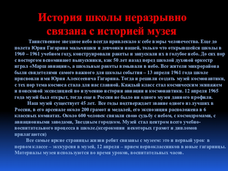 «Так, несмотря на возникшую нештатную обстановку, успешно закончился пятый и последний испытательный запуск корабля-спутника перед полетом первого человека в космос. И он произошел 12 апреля 1961 года. Пилотировал космический корабль «Восток» Ю.А. Гагарин. В этот день я снова барражировал в знакомом коридоре, но уже на Ан-2 с экипажем, при хорошей погоде, чтобы в случае нештатной ситуации оказать первую медицинскую помощь»