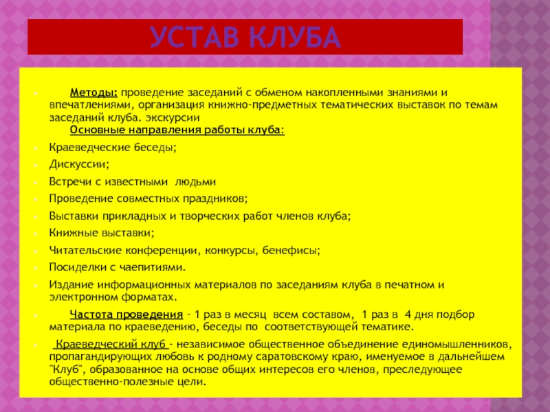 Краеведческий клуб - независимое общественное объединение единомышленников, пропагандирующих любовь к родному саратовскому краю, именуемое в дальнейшем "Клуб", образованное на основе общих интересов его членов, преследующее общественно-полезные цели.