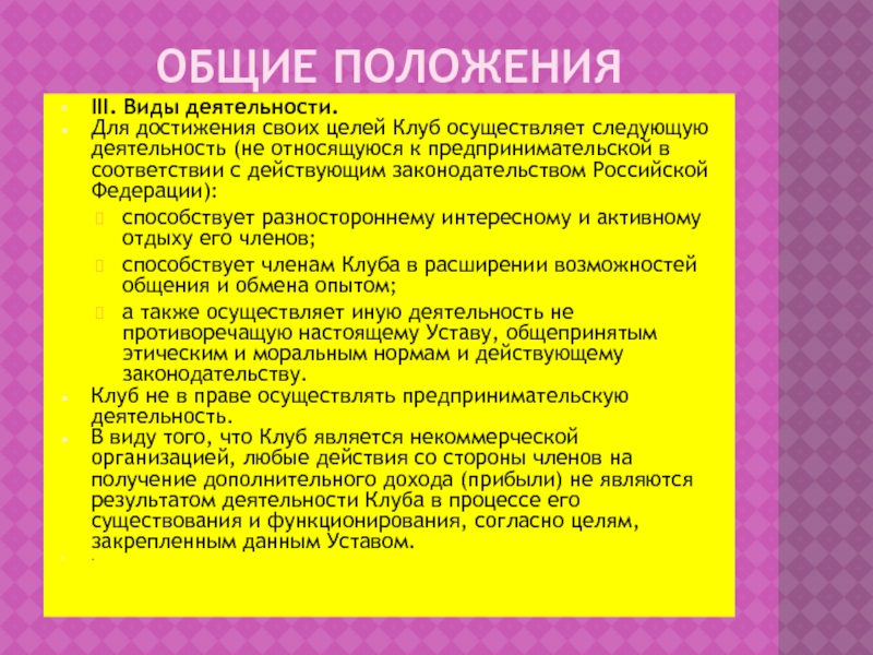 В виду того, что Клуб является некоммерческой организацией, любые действия со стороны членов на получение дополнительного дохода (прибыли) не являются результатом деятельности Клуба в процессе его существования и функционирования, согласно целям, закрепленным данным Уставом.