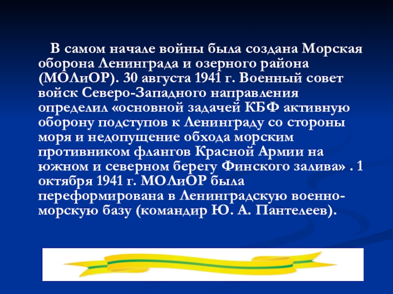 оборона Ленинграда и озерного района (МОЛиОР). 30 августа 1941 г. Военный совет войск Северо-Западного направления определил «основной задачей КБФ активную оборону подступов к Ленинграду со стороны моря и недопущение обхода морским противником флангов Красной Армии на южном и северном берегу Финского залива» . 1 октября 1941 г. МОЛиОР была переформирована в Ленинградскую военно-морскую базу (командир Ю. А. Пантелеев).