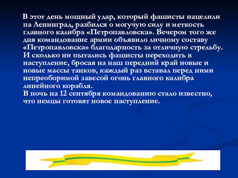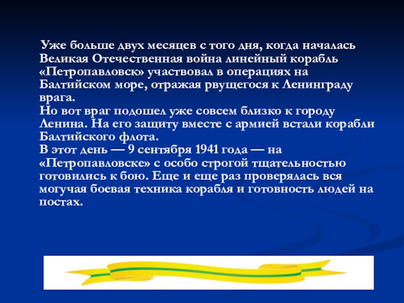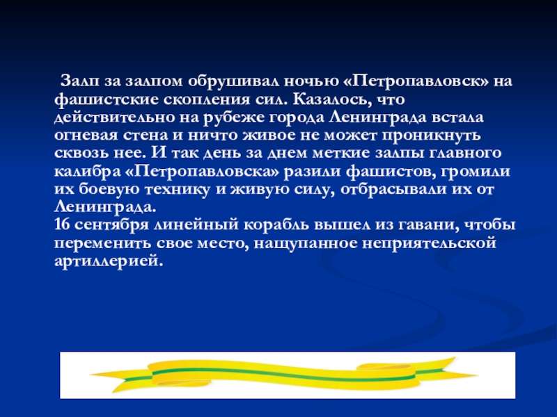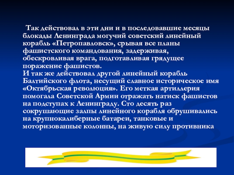 месяцы блокады Ленинграда могучий советский линейный корабль «Петропавловск», срывая все планы фашистского командования, задерживая, обескровливая врага, подготавливая грядущее поражение фашистов.
