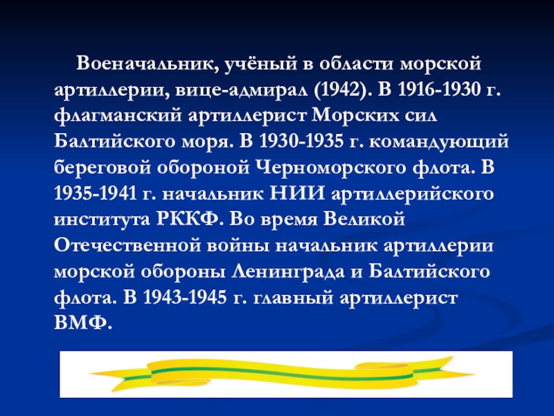 Слайд 23 Военачальник, учёный в области морской артиллерии, вице-адмирал