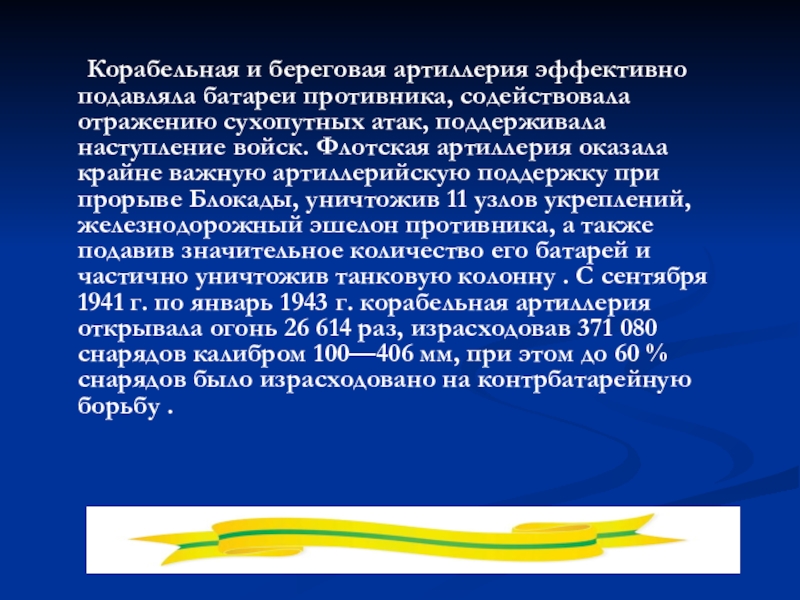 противника, содействовала отражению сухопутных атак, поддерживала наступление войск. Флотская артиллерия оказала крайне важную артиллерийскую поддержку при прорыве Блокады, уничтожив 11 узлов укреплений, железнодорожный эшелон противника, а также подавив значительное количество его батарей и частично уничтожив танковую колонну . С сентября 1941 г. по январь 1943 г. корабельная артиллерия открывала огонь 26 614 раз, израсходовав 371 080 снарядов калибром 100—406 мм, при этом до 60 % снарядов было израсходовано на контрбатарейную борьбу .