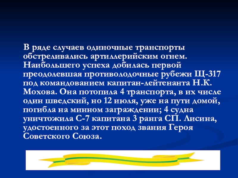 успеха добилась первой преодолевшая противолодочные рубежи Щ-317 под командованием капитан-лейтенанта Н.К. Мохова. Она потопила 4 транспорта, в их числе один шведский, но 12 июля, уже на пути домой, погибла на минном заграждении; 4 судна уничтожила С-7 капитана 3 ранга СП. Лисина, удостоенного за этот поход звания Героя Советского Союза.