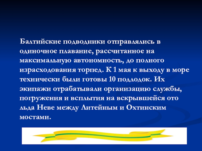 автономность, до полного израсходования торпед. К 1 мая к выходу в море технически были готовы 10 подлодок. Их экипажи отрабатывали организацию службы, погружения и всплытия на вскрывшейся ото льда Неве между Литейным и Охтинским мостами.