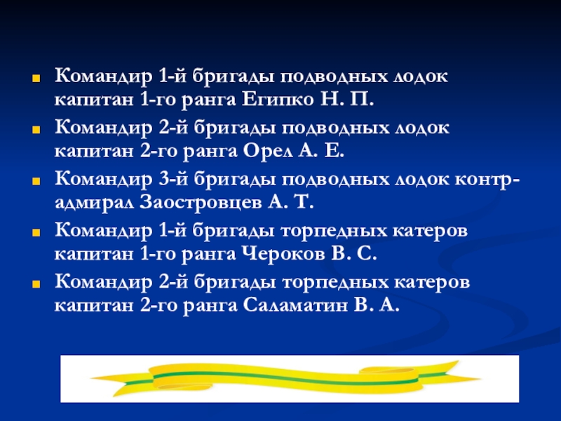 Слайд 14Командир 1-й бригады подводных лодок капитан 1-го ранга Египко Н. П.