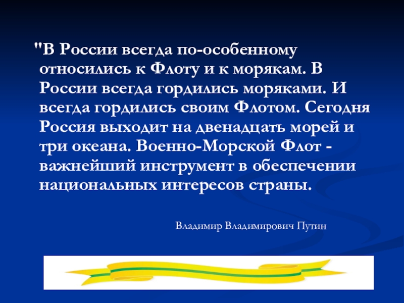 В России всегда гордились моряками. И всегда гордились своим Флотом. Сегодня Россия выходит на двенадцать морей и три океана. Военно-Морской Флот - важнейший инструмент в обеспечении национальных интересов страны.