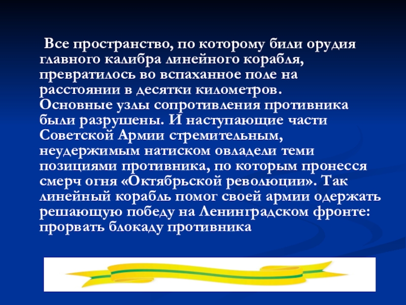 Основные узлы сопротивления противника были разрушены. И наступающие части Советской Армии стремительным, неудержимым натиском овладели теми позициями противника, по которым пронесся смерч огня «Октябрьской революции». Так линейный корабль помог своей армии одержать решающую победу на Ленинградском фронте: прорвать блокаду противника