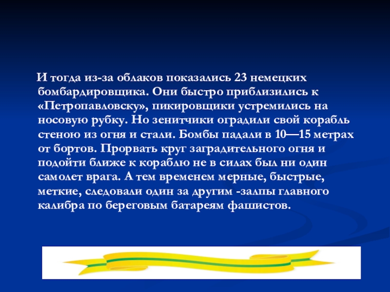 Слайд 55 И тогда из-за облаков показались 23 немецких бомбардировщика. Они