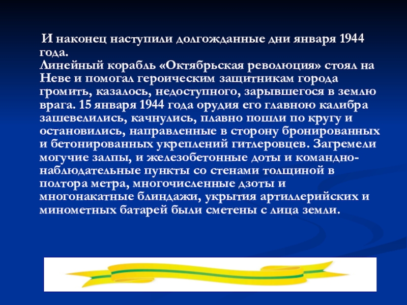 корабль «Октябрьская революция» стоял на Неве и помогал героическим защитникам города громить, казалось, недоступного, зарывшегося в землю врага. 15 января 1944 года орудия его главною калибра зашевелились, качнулись, плавно пошли по кругу и остановились, направленные в сторону бронированных и бетонированных укреплений гитлеровцев. Загремели могучие залпы, и железобетонные доты и командно-наблюдательные пункты со стенами толщиной в полтора метра, многочисленные дзоты и многонакатные блиндажи, укрытия артиллерийских и минометных батарей были сметены с лица земли.