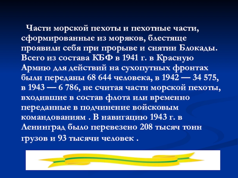 моряков, блестяще проявили себя при прорыве и снятии Блокады. Всего из состава КБФ в 1941 г. в Красную Армию для действий на сухопутных фронтах были переданы 68 644 человека, в 1942 — 34 575, в 1943 — 6 786, не считая части морской пехоты, входившие в состав флота или временно переданные в подчинение войсковым командованиям . В навигацию 1943 г. в Ленинград было перевезено 208 тысяч тонн грузов и 93 тысячи человек .