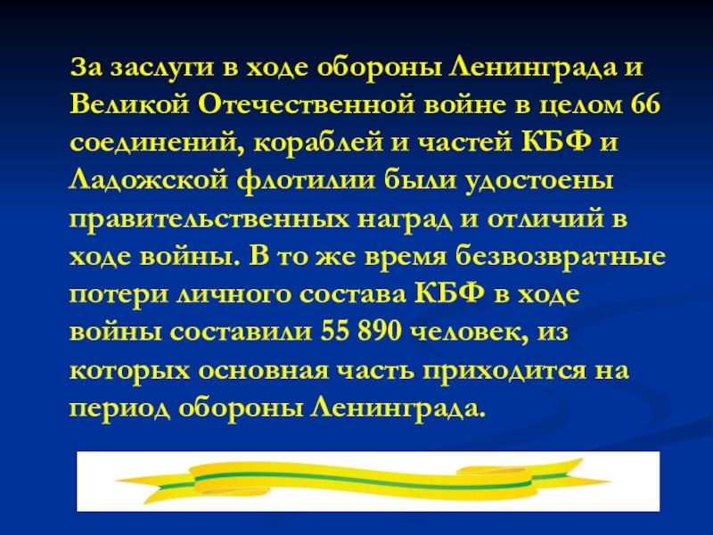 войне в целом 66 соединений, кораблей и частей КБФ и Ладожской флотилии были удостоены правительственных наград и отличий в ходе войны. В то же время безвозвратные потери личного состава КБФ в ходе войны составили 55 890 человек, из которых основная часть приходится на период обороны Ленинграда.