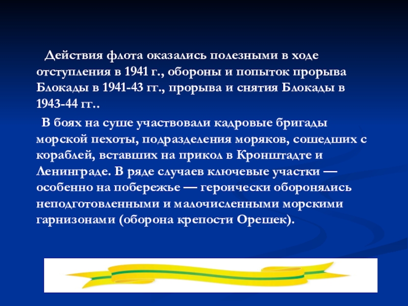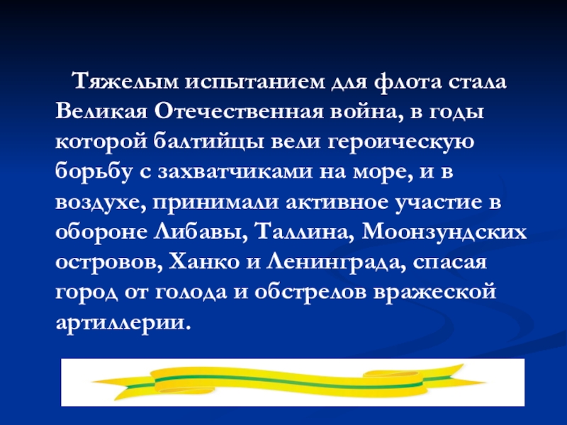 в годы которой балтийцы вели героическую борьбу с захватчиками на море, и в воздухе, принимали активное участие в обороне Либавы, Таллина, Моонзундских островов, Ханко и Ленинграда, спасая город от голода и обстрелов вражеской артиллерии.