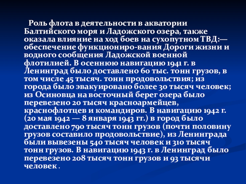 моря и Ладожского озера, также оказала влияние на ход боев на сухопутном ТВД:— обеспечение функциониро-вания Дороги жизни и водного сообщения Ладожской военной флотилией. В осеннюю навигацию 1941 г. в Ленинград было доставлено 60 тыс. тонн грузов, в том числе 45 тысяч. тонн продовольствия; из города было эвакуировано более 30 тысяч человек; из Осиновца на восточный берег озера было перевезено 20 тысяч красноармейцев, краснофлотцев и командиров. В навигацию 1942 г. (20 мая 1942 — 8 января 1943 гг.) в город было доставлено 790 тысяч тонн грузов (почти половину грузов составило продовольствие), из Ленинграда были вывезены 540 тысяч человек и 310 тысяч тонн грузов. В навигацию 1943 г. в Ленинград было перевезено 208 тысяч тонн грузов и 93 тысячи человек .