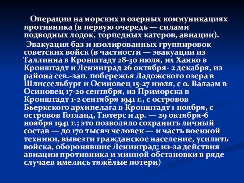 Эвакуация баз и изолированных группировок советских войск (в частности — эвакуации из Таллинна в Кронштадт 28-30 июля, их Ханко в Кронштадт и Ленинград 26 октября- 2 декабря, из района сев.-зап. побережья Ладожского озера в Шлиссельбург и Осиновец 15-27 июля, с о. Валаам в Осиновец 17-20 сентября, из Приморска в Кронштадт 1-2 сентября 1941 г., с островов Бьеркского архипелага в Кронштадт 1 ноября, с островов Гогланд, Тютерс и др. — 29 октября-6 ноября 1941 г.; это позволяло сохранить личный состав — до 170 тысяч человек — и часть военной техники, вывезти гражданское население, усилить войска, оборонявшие Ленинград; из-за действия авиации противника и минной обстановки в ряде случаев имелись тяжёлые потери)