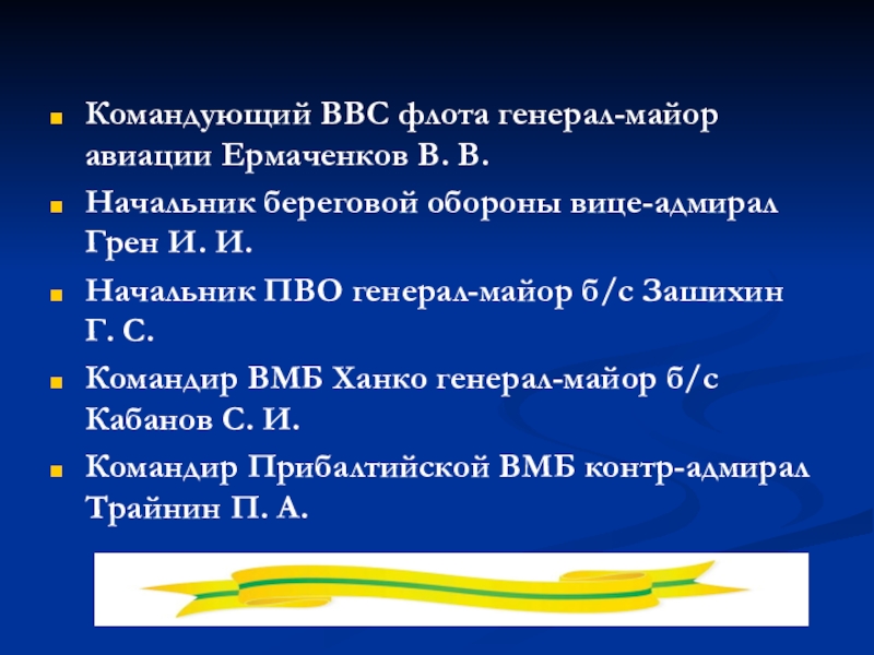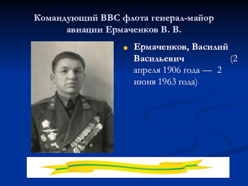 Слайд 18Командующий ВВС флота генерал-майор авиации Ермаченков В. В.