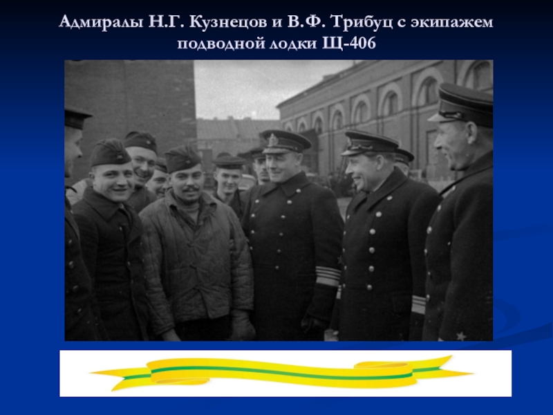 Слайд 27Адмиралы Н.Г. Кузнецов и В.Ф. Трибуц с экипажем подводной лодки Щ-406