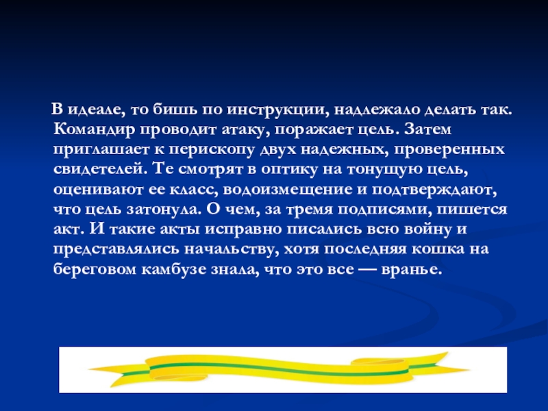 Командир проводит атаку, поражает цель. Затем приглашает к перископу двух надежных, проверенных свидетелей. Те смотрят в оптику на тонущую цель, оценивают ее класс, водоизмещение и подтверждают, что цель затонула. О чем, за тремя подписями, пишется акт. И такие акты исправно писались всю войну и представлялись начальству, хотя последняя кошка на береговом камбузе знала, что это все — вранье.