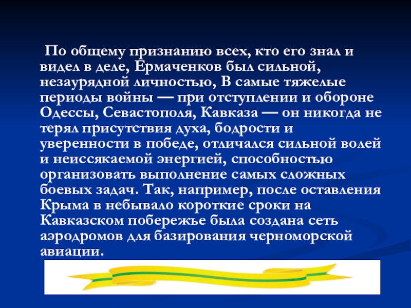 видел в деле, Ермаченков был сильной, незаурядной личностью, В самые тяжелые периоды войны — при отступлении и обороне Одессы, Севастополя, Кавказа — он никогда не терял присутствия духа, бодрости и уверенности в победе, отличался сильной волей и неиссякаемой энергией, способностью организовать выполнение самых сложных боевых задач. Так, например, после оставления Крыма в небывало короткие сроки на Кавказском побережье была создана сеть аэродромов для базирования черноморской авиации.