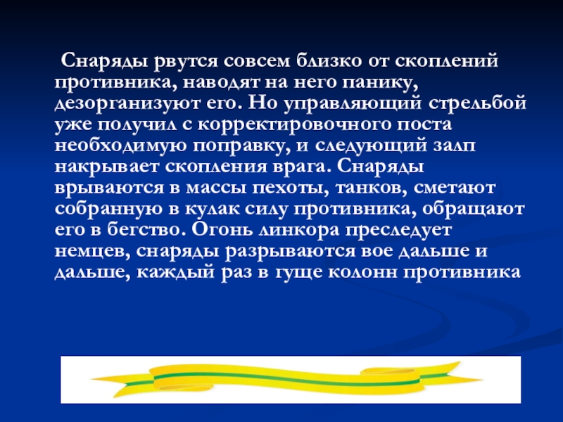 на него панику, дезорганизуют его. Но управляющий стрельбой уже получил с корректировочного поста необходимую поправку, и следующий залп накрывает скопления врага. Снаряды врываются в массы пехоты, танков, сметают собранную в кулак силу противника, обращают его в бегство. Огонь линкора преследует немцев, снаряды разрываются вое дальше и дальше, каждый раз в гуще колонн противника