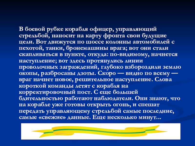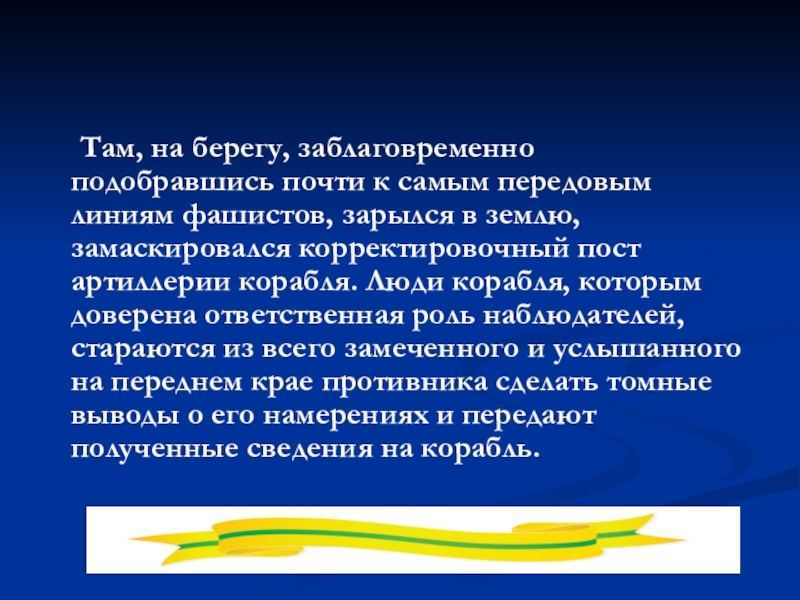 передовым линиям фашистов, зарылся в землю, замаскировался корректировочный пост артиллерии корабля. Люди корабля, которым доверена ответственная роль наблюдателей, стараются из всего замеченного и услышанного на переднем крае противника сделать томные выводы о его намерениях и передают полученные сведения на корабль.