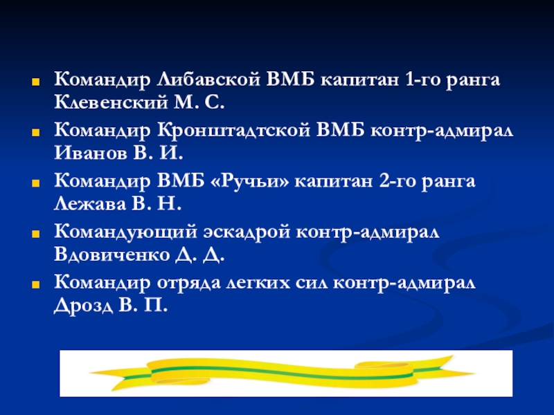Слайд 13Командир Либавской ВМБ капитан 1-го ранга Клевенский М. С.
