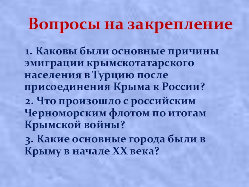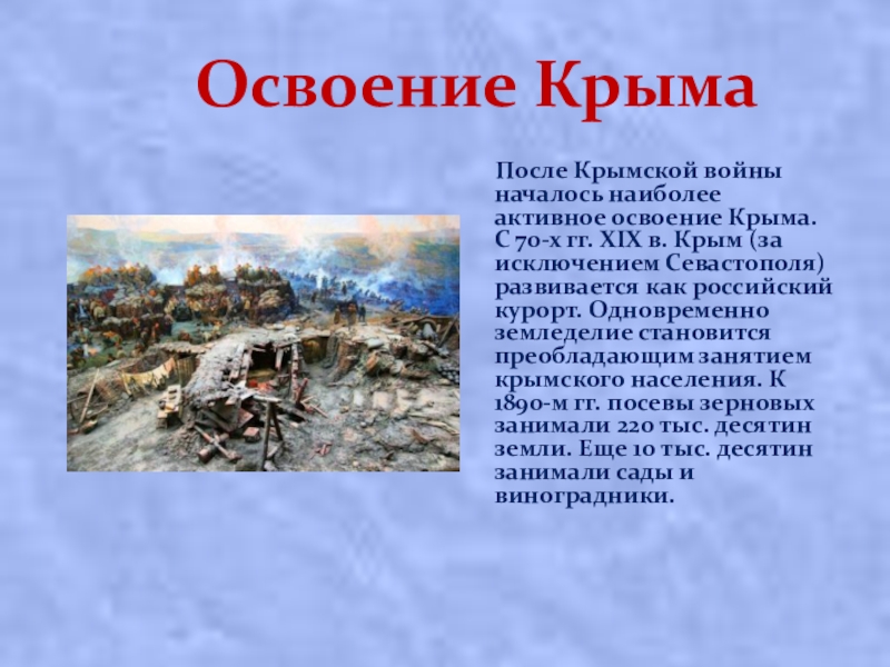 активное освоение Крыма. С 70-х гг. XIX в. Крым (за исключением Севастополя) развивается как российский курорт. Одновременно земледелие становится преобладающим занятием крымского населения. К 1890-м гг. посевы зерновых занимали 220 тыс. десятин земли. Еще 10 тыс. десятин занимали сады и виноградники.